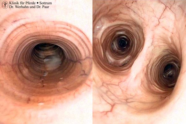 Außerdem verfügt die Klinik über ein hochauflösendes, starres Endoskop zur Maulhöhlenendoskopie. Weitere starre Endoskope kommen bei der Arthroskopie (Gelenkspieglung) und der Brust- und Bauchhöhlenspiegelung (Thorako- und Laparoskopie) zum Einsatz. Alle Endoskope (auch die flexiblen!) durchlaufen nach jedem Einsatz am Patienten eine spezielle Reinigung und Sterilisation, um die Übertragung von Infektionserregern auszuschließen. Im Rahmen einer Druse oder im Verlauf anderer Streptokokken-Infektionen kommt es häufig zu Luftsackvereiterungen, die eine Spülung der Luftsäcke notwendig machen. Wiederholte Luftsackspülungen sind auch eine unterstützende Maßnahme bei der Behandlung von Luftsackmykosen und werden bevorzugt unter Sichtkontrolle über den Arbeitskanals des Endoskops durchgeführt. Die Endoskopie hat weiter ihren Platz bei der Behandlung von Luftsacktympanien und endoskopisch erreichbaren Tumoren im Nasenrachenraum. Über den Arbeitskanal des Endoskops können spezielle Instrumente eingeführt und so mittels Hochfrequenzchirurgie chirurgische Eingriffe oder lokale Injektionsbehandlungen vorgenommen werden. Die Kehlkopfspiegelung dient vor allem der Beurteilung der Kehlkopffunktion. Bei vollständiger oder unvollständiger, einseitiger Kehlkopflähmung treten häufig abnorme Atemgeräusche ("Kehlkopfpfeifen") auf. Aber auch eine Fülle anderer, krankhafter Befunde kann im Rachenraum zu einer Leistungsbeeinträchtigung führen. Einige treten nur in der Bewegung oder im Training auf. Hier wird die Diagnostik am gerittenen oder longierten Pferd mittels Overgroundendoskopie durchgeführt. In besonderen Fällen oder wenn die Sekretmengen in der Luftröhre nicht ausreichen, kann die Durchführung einer bronchoalveolären Lavage (BAL) zur Gewinnung von Spülproben aus der Lunge angezeigt sein. Die zytologische Untersuchung des TBS und die Probenaufarbeitung der zeitlich nur sehr begrenzt haltbaren BAL-Spülproben erfolgt im klinikeigenen Labor. Neben neurologischen Erkrankungen (z.B. Fehlanpassungssyndrom beim neugeborenen Fohlen, Grassickness, Botulismus...) können Fremdkörper im Rachen oder am Kehlkopf zu starken Entzündungen und Schluckstörungen führen. Bei günstiger Lage können die Fremdkörper schonend mit Hilfe von über den Arbeitskanal des Endoskopes eingeführten Greifinstrumenten entfernt werden. Schwere, in der Praxis "therapieresistente" Schlundverstopfungen stellen oft eine Indikation zu Spiegelung des Schlundes und der Luftröhre dar. Durch die Darstellung des verursachenden Fremdmaterials (häufig nicht eingeweichte Trockenschnitzel, Pellets, Raufutter beim Saugfohlen...) oder Fremdkörpers (kleine Äpfelchen, Stücke von roten Beeten ....) kann ein gezielteres therapeutisches Vorgehen (Spülbehandlung oder Fremdkörperbehandlung evtl. mit Zerkleinerung) eingeleitet werden. Außerdem können das Ausmaß von Schlundveränderungen und -verletzungen sowie der Grad der Futteraspiration (Verschlucken) in der Luftröhre festgestellt werden. Dies ist entscheidend für die Nachbehandlung einer Schlundverstopfung: Womit darf das Pferd wieder angefüttert werden? Sind längere Zeit diätetische Maßnahmen notwendig? Welche medikamentöse Behandlung der Lunge ist wegen einer Futteraspiration notwendig? Wiederkehrende Schlundverstopfungen können ihre Ursache in Schlundverletzungen, Narbenbildung (Strikturen), dem Vorliegen von krankhaften Aussackungen im Schlund (Divertikelbildung) und umschriebenen, neurogenen Motilitätsstörungen haben. Alle diese Befunde lassen sich endoskopisch darstellen. Ergänzend sind röntgenologische Untersuchungen nach Gabe von Kontrastmitteln möglich. Differentialdiagnostisch muss an Probleme bei dem Zerkleinern der Futters (Untersuchung der Maulhöhle und Gebisskontrolle!) gedacht werden. Über den Arbeitskanal des Endoskopes ist die selektive Entnahme einer Harnprobe aus den Harnleitern zur speziellen Diagnostik bei Nierenerkrankungen möglich. Im Rahmen der Transendoskopischen Lithotripsie wird mittels einer über den Arbeitskanal eingeführten Sonde unter Sicht mithilfe von Stoßwellen der Harnstein zertrümmert und im Anschluss die Einzelteile des Blasensteins über einen Kather durch die Harnröhre herausgespült. Das Verfahren soll in Abhängigkeit der Härte und Beschaffenheit der Harnsteine bei ca. 80 % der erkrankten Pferde zum Erfolg führen und stellt damit eine Alternative zur operativen Behandlung dar. Durch die Bildung von Lymphzysten (sog. Endometriumzysten) in der Gebärmutterschleimhaut wird die Fruchtbarkeit eingeschränkt. Dies tritt überwiegend bei älteren Stuten auf, die schon mehrmals abgefohlt haben. Die Behandlung erfolgt mittels minimal-invasiver endouteriner Chirurgie (Transendoskopische Hochfrequenzchirurgie) mit einer günstigen Prognose für die Verbesserung der Fruchtbarkeit. Die Behandlung kann ambulant, aber nur außerhalb der Rosse bei geschlossenem Muttermund durchgeführt werden. >>> Zurück zur Ausstattungsübersicht. |