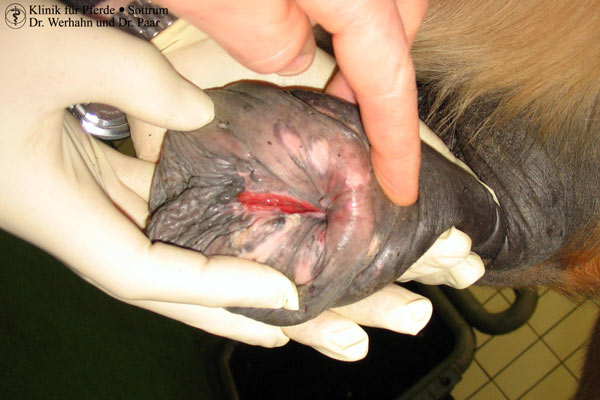 Zahlreiche Hauterkrankungen (anhaltendes Maukeekzem, nässende und eitrige Hautveränderungen, schwerer Einschuss, Hautnekrosen durch Bandagen, Verbrennungen) erfordern oft eine intensive und konsequente lokale Behandlung (Scheren, Rasur, tägliche Waschung und lokale Medikaton, evtl. Anlegen von Verbänden). Auch die Verabreichung von Medikamenten über das Futter oder durch Injektionen kann notwendig sein. Aufgrund der Schmerzhaftigkeit lassen die betroffenen Pferde eine lokale Behandlung im akuten Erkrankungsstadium ohne Beruhigungsspritze oft nicht zu. Oft erlauben auch die Verhältnisse im Heimatstall keine optimale Behandlung. Daher kann es sinnvoll sein, durch eine Behandlung in der Klinik mal "Grund" in die Sache zu kriegen.
