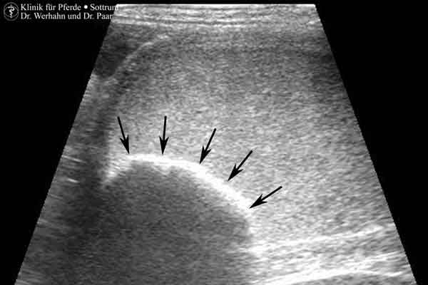 Die Ultraschalluntersuchung der Bauchhöhle erfolgt von außen durch die Bauchdecken (transkutan) und soweit möglich von dem Mastdarm (transrektal) aus. Sie ist im Rahmen der Kolik-Untersuchung nicht nur beim Fohlen und Pony angezeigt (keine oder nur eingeschränkte Möglichkeit zur rektalen Untersuchung), sondern kann auch beim Großpferd eine sinnvolle Ergänzung des Untersuchungsganges darstellen. Es werden Informationen zum Füllungszustand, der Wandbeschaffenheit und der Motilität des Magens und einzelner Darmabschnitte gewonnen werden. Veränderungen der Bauchhöhlenflüssigkeit sind zu erkennen.